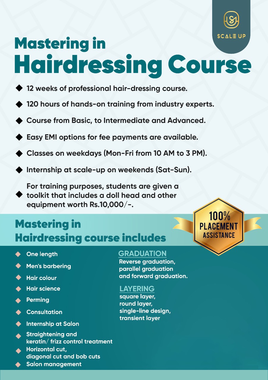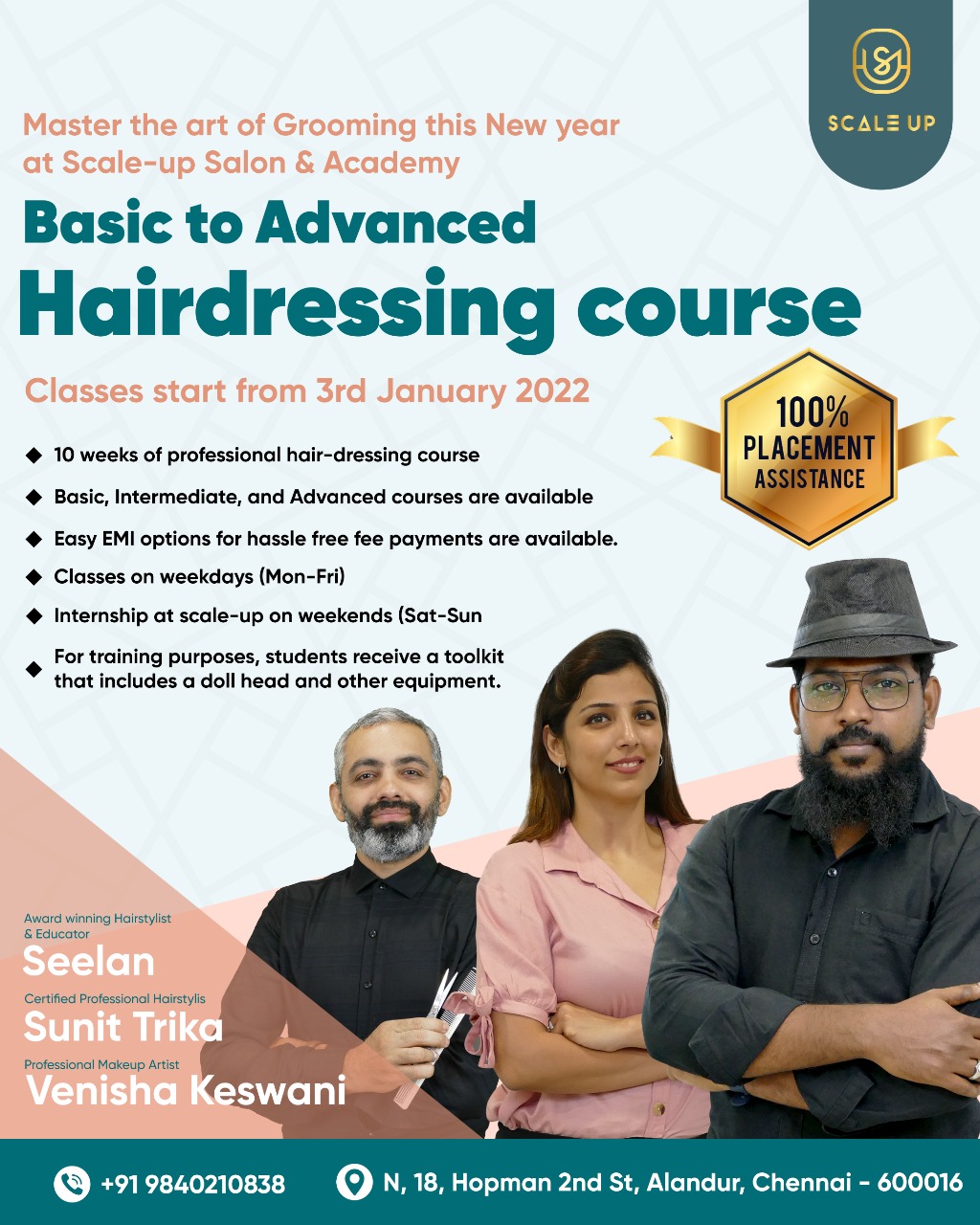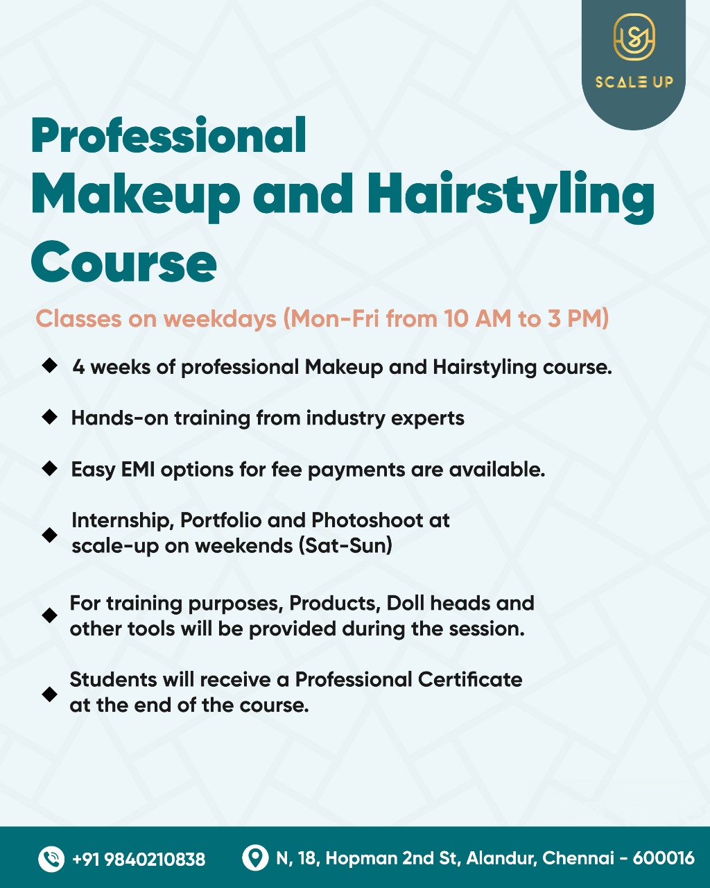 The most comprehensive, yet straightforward, courses. Basic to Advanced Hairdressing, Masters in Hairdressing and Professional Makeup and Hairstyling Course course in Chennai at Scaleup academy! Over 120 hours of hands-on training from industry experts and 10 weeks of robust course.